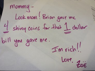 She ran up the steps so excited.  “Look what Brian gave me.”  She proudly shows me her loot “On really big one (a quarter), a thick one (a nickel), a tiny one (a dime) and a gold one (a penny).  I have four mom.”