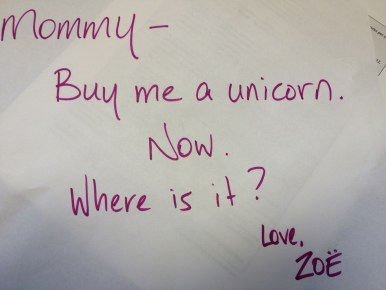 “If you want a unicorn, you have to save your money,” I reply.  (I had to repeat it twice because her attention span is that of a flea)