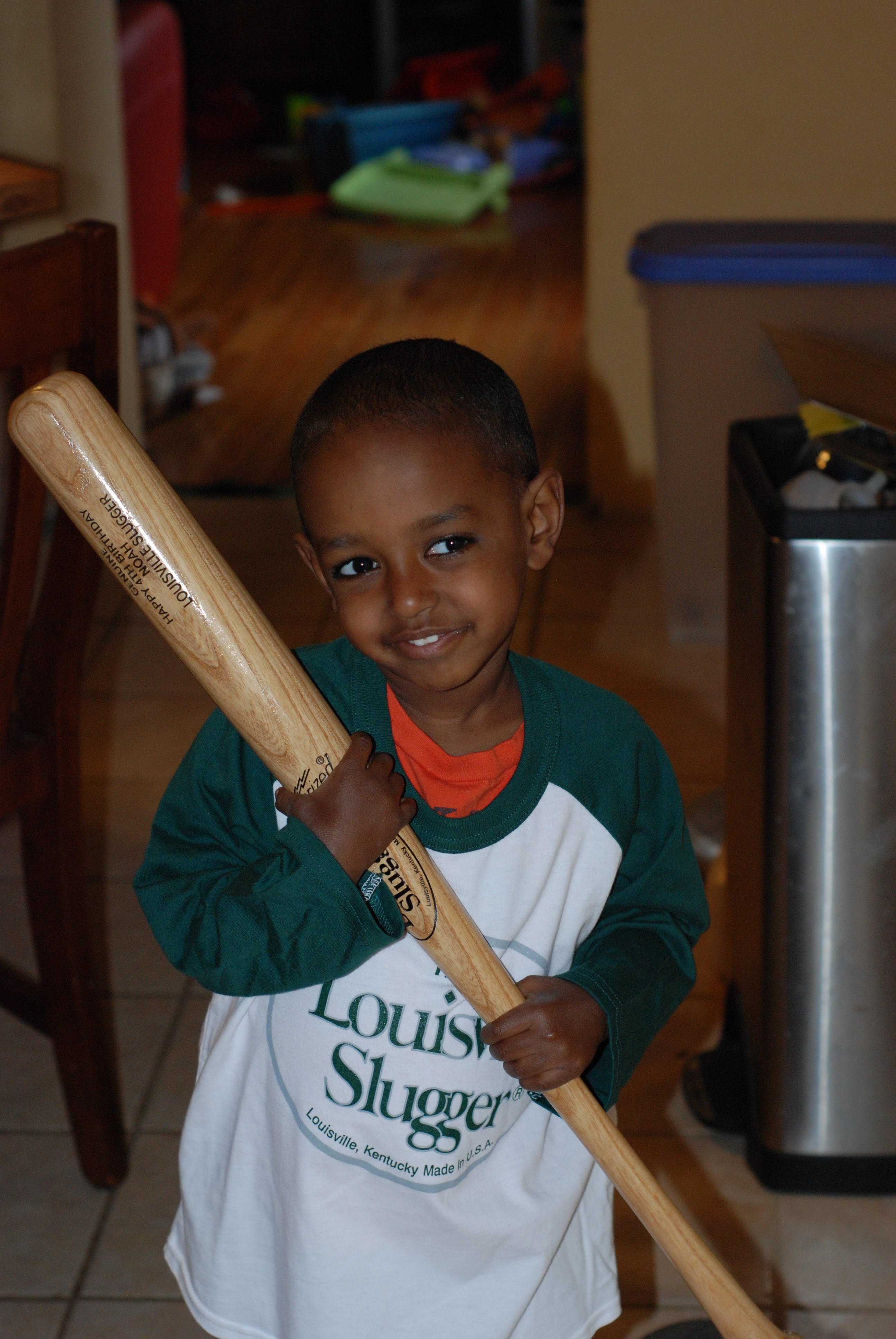 While in Louisville, I visited the Louisville Slugger factory and got Noah a real baseball bat–he’s been practicing baseball at home–he’s got a bit of an affinity for hitting and throwing–and he had asked for a real bat. He was so excited and surprised to get the bat for his birthday. It’s a little big/heavy for him but I wanted to get him one he could grow into and not out off too quickly.